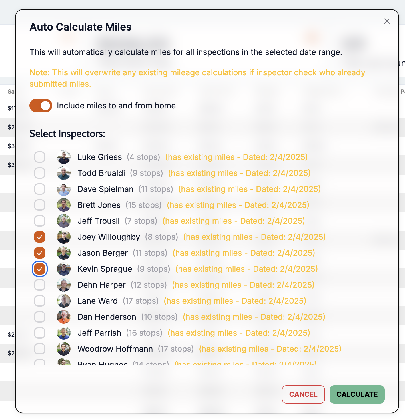 Each employee can be selected to run in the calculation. Calculate miles for only employees that didn’t report or everyone.