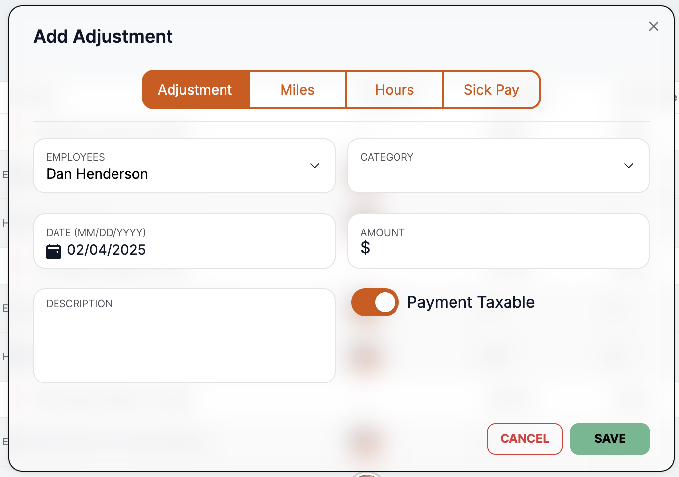 These items either pull from other sources or can be entered manually with Add Adjustments model. This can be found in the bottom right “+“ menu in the payroll report or on the HR Page. Human Resources Overview