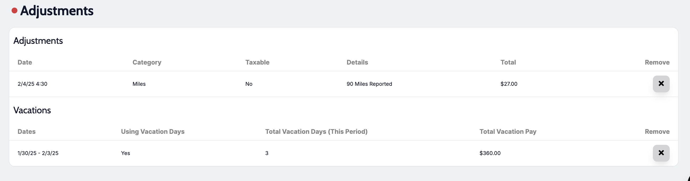 Adjustments will show everything else including miles, bonuses, adjustments (reimbursements, etc) vacation pay, sick pay, etc.