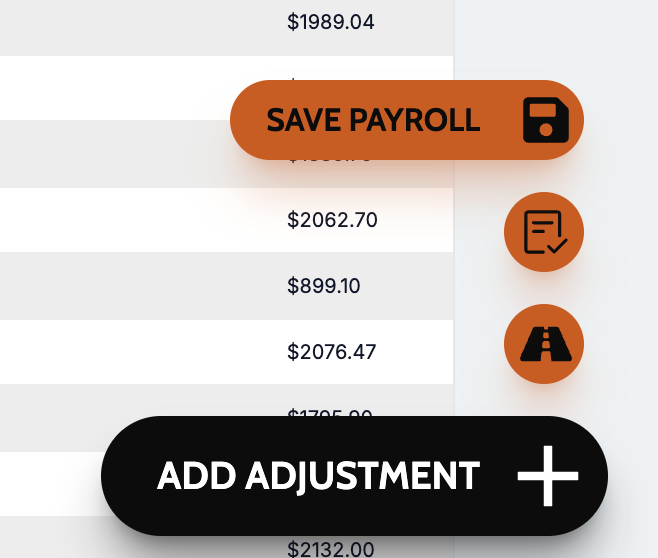 The payroll run is all live data and calculated in real time. If you see an error, add an adjustment, change a split, etc, you'll see the calculation update. These changes are written directly to the jobs themselves so everything is saved and persists if you come back later.